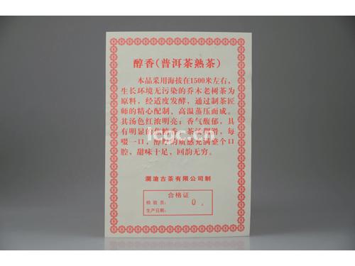 【名称】醇香大饼 【规格】357g/片,15kg/件 【工艺】熟茶 【生产日期】2011年9月18日 【产品简介】本品采用海拔在1500米左右,生长环境无污染的乔木老树茶为原料,经适度发酵,通过制茶匠师的精心配制、高温蒸压而成。其汤色红浓明亮;香气馥郁,具有明显的焦糖香;茶汤稠滑,每啜一口,醇厚的质感充满整个口腔,甜味十足,回韵无穷。
