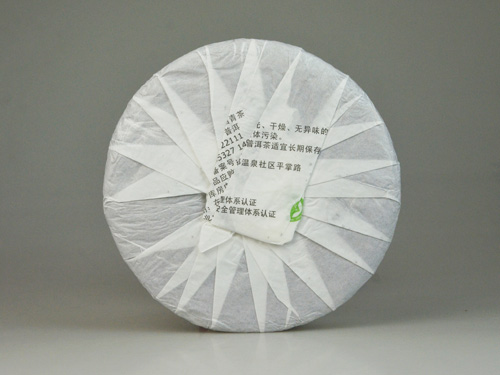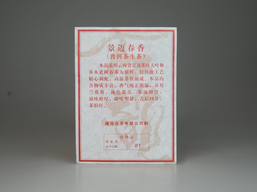 【名称】景迈春香大饼 【系列】古韵系列 【规格】357g/片,10kg/件 【工艺】生茶 【生产日期】2013年6月28日 【产品简介】本品采用云南省景迈茶区大叶种乔木老树春茶为原料,经传统工艺精心调配,高温蒸压而成。本品内含物质丰富,香气纯正浓郁,具有兰花香,汤色黄亮,茶汤细滑,滋味醇厚,甜味明显,苦后回甘,茶韵好。