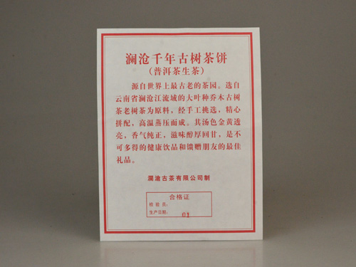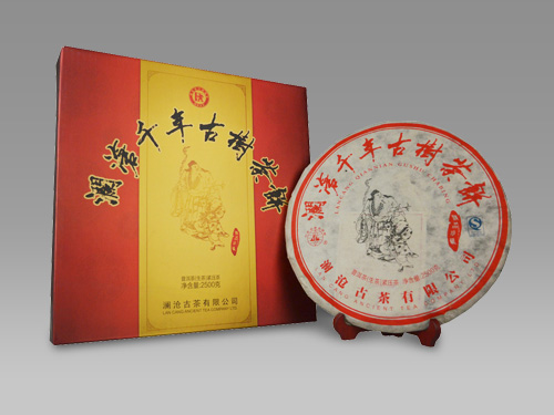 【名称】澜沧千年古树茶饼(2.5kg) 【系列】古韵系列 【规格】2500g/片/盒,6盒/件 【工艺】生茶 【生产日期】2012年12月18日 【产品简介】源于世界上最古老的茶园。选自云南省澜沧江流域的大叶种乔木古树茶老树茶为原料,经手工挑选,精心拼配,高温蒸压而成。其汤色金黄、透亮、香气纯正、滋味回甘,是不可多得的健康饮品和馈赠朋友的最佳礼品。