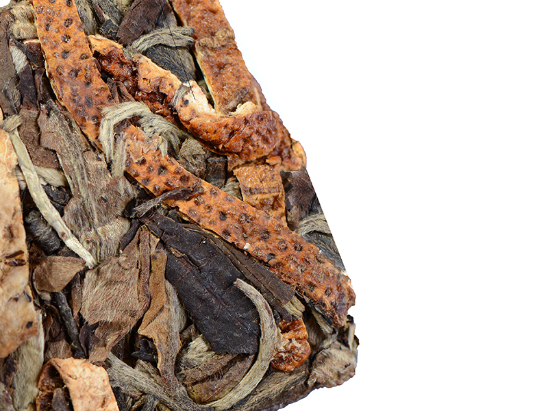 小砖规则平整、压制松紧适度,白茶中镶嵌陈皮丝,分布均匀,白茶的甘醇和陈皮的陈香交织,甘、甜、润,饮之口齿生津。